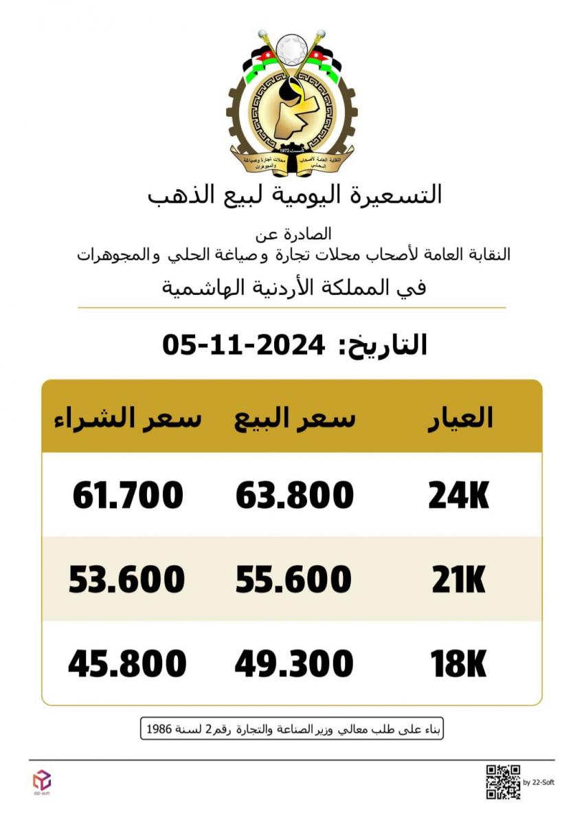 وبحسب التسعيرة اليومية الصادرة عن النقابة العامة لأصحاب محال تجارة وصياغة الحلي والمجوهرات، فقد بلغ سعر بيع الغرام الواحد من الذهب عياري 24 و18 لغايات الشراء من محالّ الصاغة، 63.80 و49.30 دينارا على التوالي.