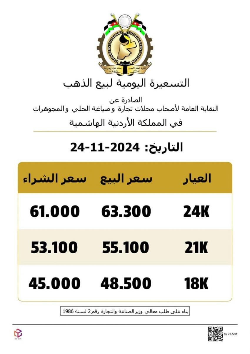 وبلغ سعر بيع غرام الذهب عيار 21 الأكثر طلبا لدى الأردنيين، عند 55.10 دينارا ، مقابل 53.10 دينارا لجهة الشراء.