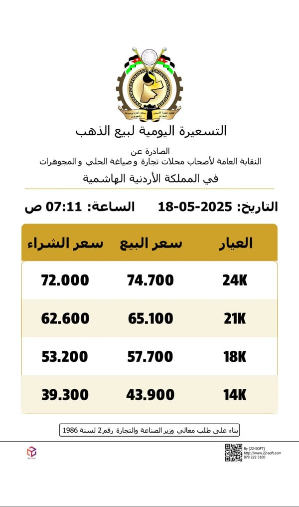 كما بلغ سعر بيع الغرام الواحد من الذهب عيارات 24 و18 و14 لغايات البيع من محلات الصاغة، 74.70 و57.70 و43.90 دينارا على التوالي.