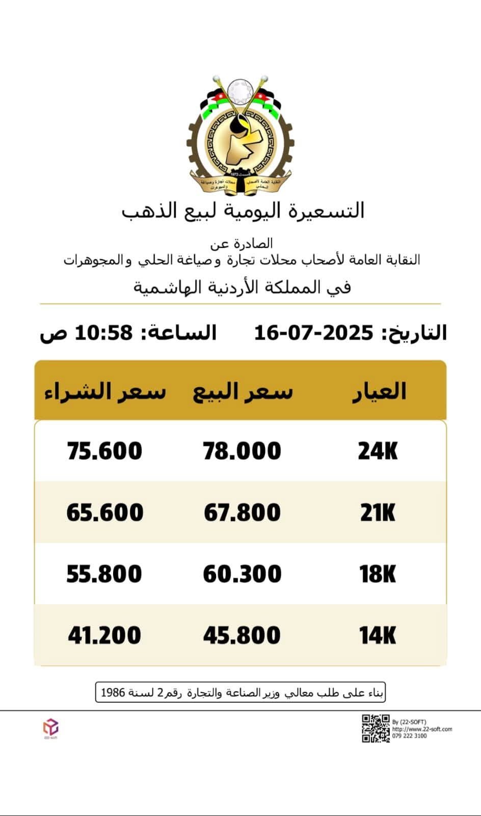 وحسب النشرة اليومية التي أصدرتها النقابة العامة لأصحاب محلات تجارة وصياغة الحلي والمجوهرات، بلغ سعر الغرام الواحد من الذهب عيارات 24 و18 و14 لغايات البيع من محلات الصاغة عند 78 دينارا و60.30 و45.80 دينار على التوالي.