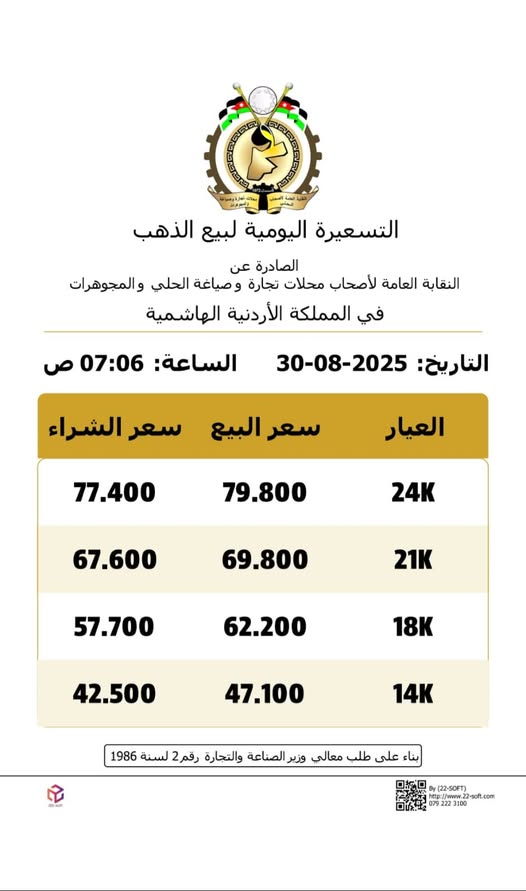 وبحسب التسعيرة اليومية الصادرة عن النقابة العامة لأصحاب محال تجارة الحلي والمجوهرات، ارتفع أيضا سعر بيع الغرام الواحد من الذهب عياري 24 و18 من محال الصاغة، ليبلغ 79.80دينارا و62.20 دينارا على التوالي.