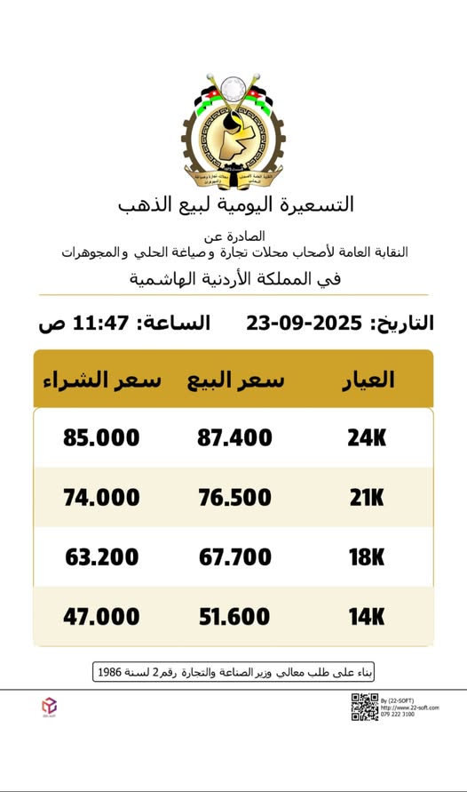 كما ارتفع سعر بيع الغرام الواحد من الذهب لعيارات 24 و18 و14 لغايات الشراء من محلات الصاغة، ليصل إلى 87.4 و67.7 و51.6 دينارا على التوالي.