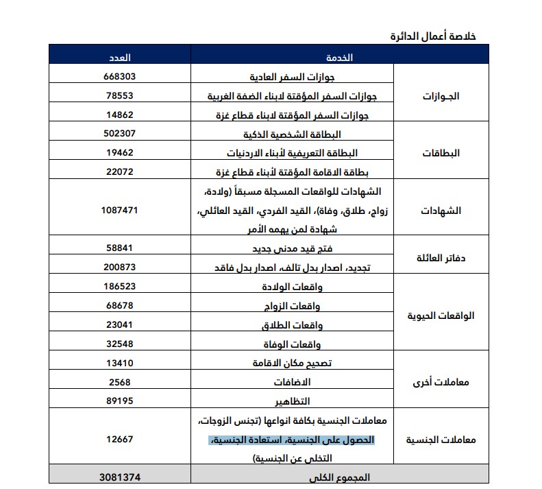 أخبار الاردن-نبراس نيوز- بلغ عدد معاملات الجنسية بكافة أنواعها (تجنس الزوجات، والحصول على الجنسية، واستعادة الجنسية، والتخلي عن الجنسية)، التي أنجزتها دائرة الأحوال المدنية والجوازات في العام 2024، 12667 معاملة.