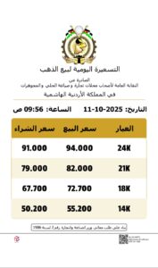 ووفقًا للنشرة اليومية الصادرة عن النقابة العامة لأصحاب محلات تجارة وصياغة الحلي والمجوهرات، سجل سعر الغرام الواحد من الذهب لعيارات 24 و18 و14 إلى 94.00 دينارًا و72.70 دينارا و55.20 دينارًا على التوالي، لغايات البيع من محلات الصياغة.