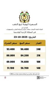 فيما ارتفعت أسعار الذهب من العيار ذاته لجهة الشراء إلى 80.8 دينار، مقابل 78.90 دينارا.