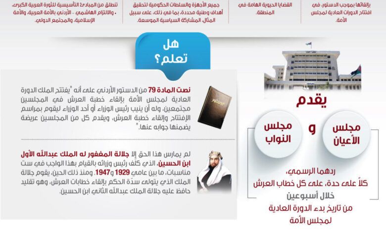 أخبار الاردن-نبراس نيوز- يلقي جلالة الملك عبدالله الثاني، بعد قليل، خطاب العرش السامي في افتتاح الدورة العادية الثانية لمجلس الأمة العشرين، بشقيه (النواب والأعيان)، يستعرض فيه السياسات الوطنية ومرتكزات القضايا الإقليمية المهمة.
