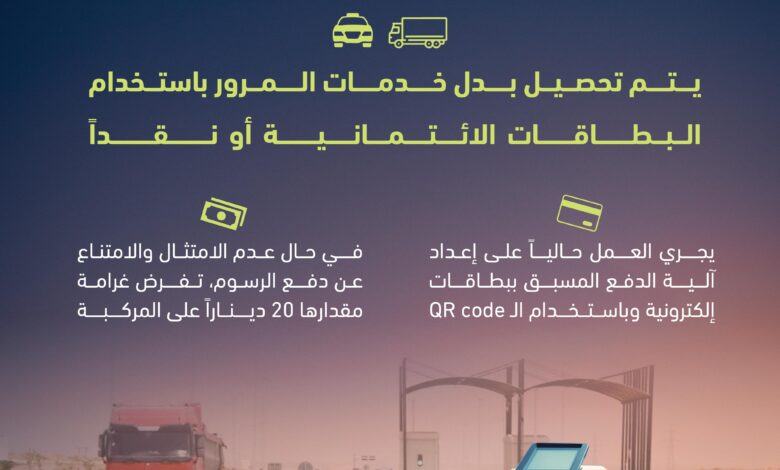 وفي حال مرور المركبة دون سداد الرسوم، تُفرض غرامة مقدارها (20) ديناراً. وسيجري تحصيل بدل الخدمات نقداً أو ببطاقات الائتمان، فيما تعمل الوزارة حالياً على تطوير آلية دفع مسبق عبر بطاقات ذكية باستخدام رمز QR لتسهيل عملية العبور والدفع الإلكتروني.