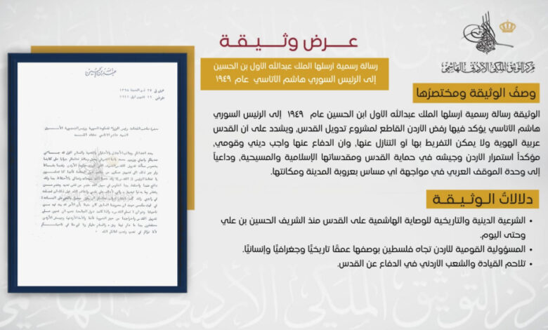 وأوضح المركز في بيان، الثلاثاء، أن الرسالة تضمنت تأكيد الملك عبد الله الأول برفض الأردن القاطع لكل ما يمس عروبة القدس الشريف وتدويلها وأنه لا تفريط بها أو تنازل عنها، قائلا: “إننا والأمة الأردنية وجيش الأردن محتفظون بها ما دام فينا رمق”.