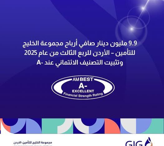 9.9 مليون دينار صافي أرباح مجموعة الخليج للتأمين – الأردن للربع الثالث من عام 2025 وتثبيت التصنيف الائتماني عند -A