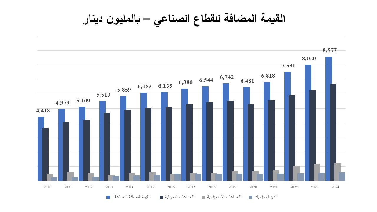 وبينت الغرفة أن القيمة المضافة للقطاع الصناعي بالمملكة بلغت 8.6 مليار دينار خلال العام الماضي، مقابل 4.4 مليار دينار في 2010 وبزيادة تراكمية تجاوزت 94% وبمعدل نمو سنوي يقارب 5% خلال العقد الماضي.