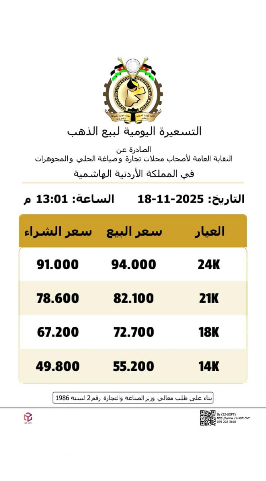 وبلغ سعر الغرام الواحد من الذهب عيارات 24 و18 و14 لغايات البيع من محلات الصاغة عند 94 و72.70 و55.20 دينارا على التوالي.