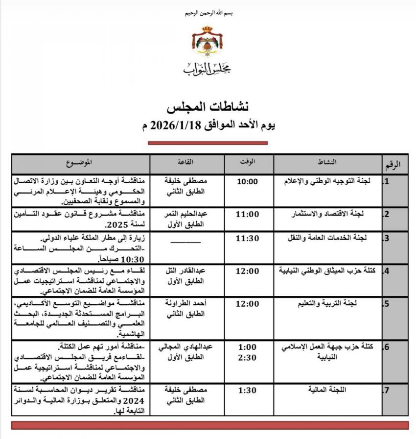 وتناقش لجنة الاقتصاد والاستثمار مشروع قانون عقود التأمين لسنة 2025، فيما تناقش اللجنة المالية تقرير ديوان المحاسبة لسنة 2024 والمتعلق بوزارة المالية والدوائر التابعة لها.