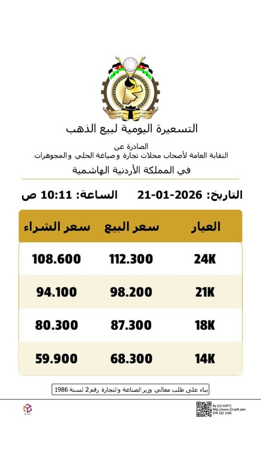 وبلغ سعر الغرام الواحد من الذهب عيارات 24 و18 و14 لغايات البيع من محالّ الصاغة 112.3 و 87.3 و 68.3 دينارا على الترتيب.