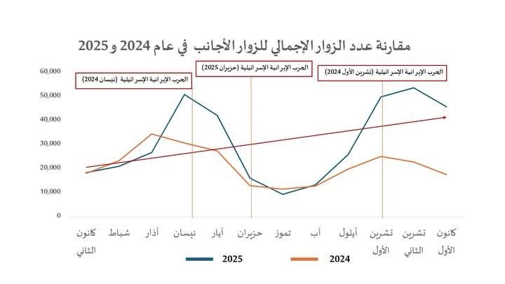 وأظهرت البيانات أن شهر تشرين الأول سجّل أعلى عدد من الزوار خلال عام 2025 بواقع 81,069 زائراً، فيما شهد شهر كانون الأول تحسناً لافتاً بعدد 53,383 زائراً، محققاً نمواً بنسبة 95% مقارنة بالشهر ذاته من عام 2024.