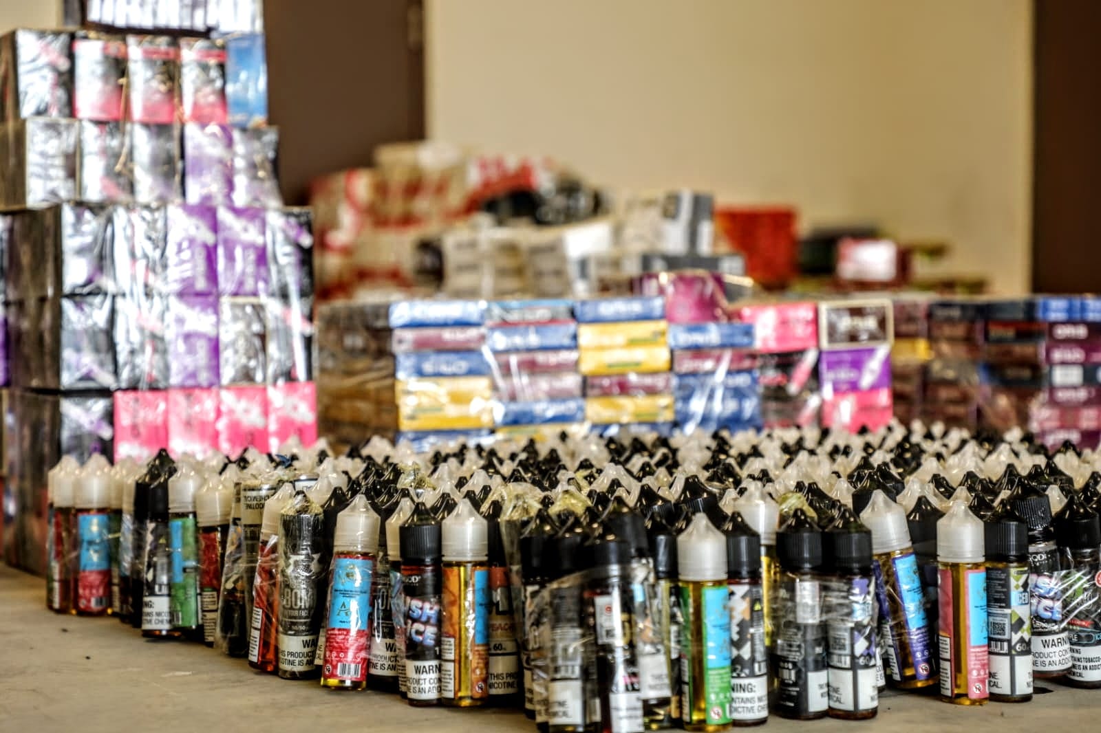 حيث أن المضبوطات اشتملت على 6500 عبوة جوس ونصف طن معسل مشكل وتبغ 20 كيلو غير صالح للاستهلاك 2000 كروز دخان وبودات للسجائر الإلكترونية عدد 280 وبضائع مقلدة ممنوعة متنوعة.