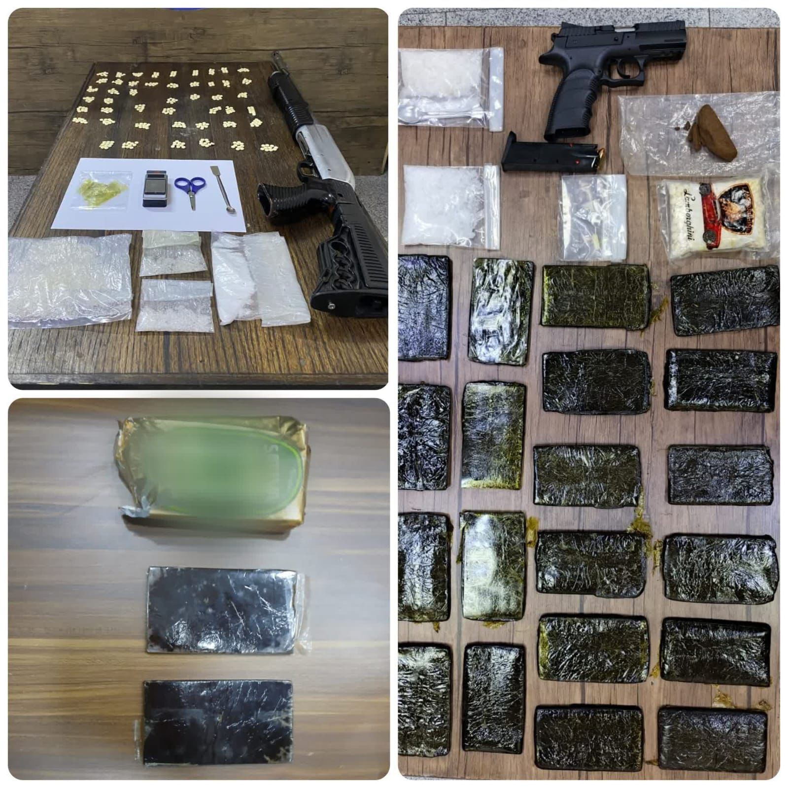 وفي محافظة المفرق وبعد مراقبة وجمع المعلومات عن أحد الأشخاص المشتبه بتورطه بالتعامل مع عصابات إقليمية لتهريب المخدرات والتأكد من نشاطاته الجرمية وحيازته للمواد المخدرة واستخدامه مزرعة في محافظة المفرق لتخزين وبيع تلك المواد، فقد جرت مداهمته وإلقاء القبض عليه وضُبط بحوزته 3 كيلو غرام من مادّة الكريستال المخدرة و 90 كف حشيش و 3000 آلاف حبّة مخدرة.