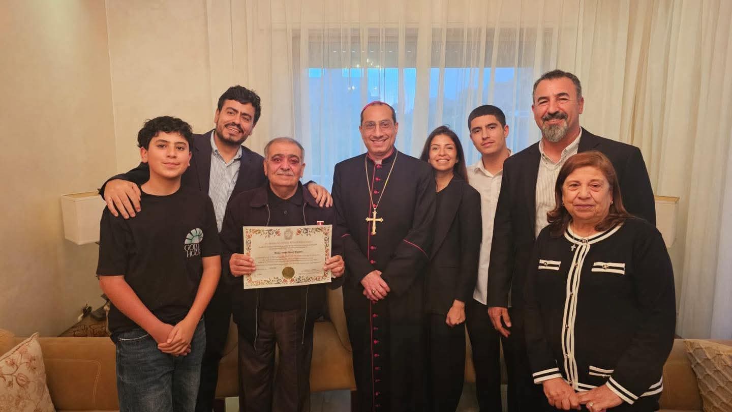 قلّده الوسام سيادة المطران اياد الطوال، النائب البطريركي في بيته المبارك، بحضور أفراد العائلة، وبمشاركة الأب حنا كلداني كاهن الرعية، والأب عماد علمات أمين عام المطرانية، والاب اكثم حجازين، رئيس المحكمة الكنسية، والاب بطرس حجازين، من المعهد الاكليريكي، وفي أجواء مفعمة بالود والمحبة.